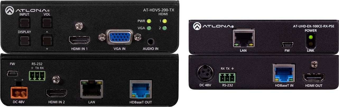 The Atlona 4K-HDVS-EXT is an HDBaseT transmitter and receiver kit that delivers a complete integration solution with 4K/UHD extension, automatic HDMI and VGA input switching, and automatic display control. It includes the AT-HDVS-200-TX three-input HDBaseT switcher and AT-UHD-EX-100CE-RX-PSE HDBaseT receiver.
