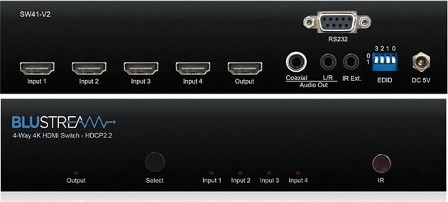 The Blustream SW41AB-V2 is a 4-Way HDMI switch with integrated audio breakout. The V2 switch supports full HDMI 2.0 and HDCP 2.2 with video resolutions up to and including 4K @ 60Hz 4:4:4.