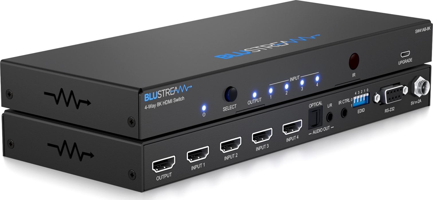 With selection of 4 x HDMI input sources, the SW41AB-8K can auto-switch based on detecting a 5V hot plug, or a new TMDS signal, RS-232, or manually using IR, or the front panel.