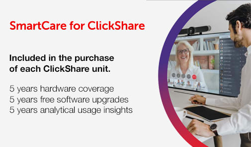 SmartCare is a service package included in the purchase of each ClickShare Conference and Present unit. Activate your SmartCare package for your ClickShare unit at any time within 6 months of your purchase by adding your unit to the XMS Cloud platform. You can access the XMS Cloud via the device’s web configurator. If the SmartCare package is not activated, a standard warranty of 1 year will apply.