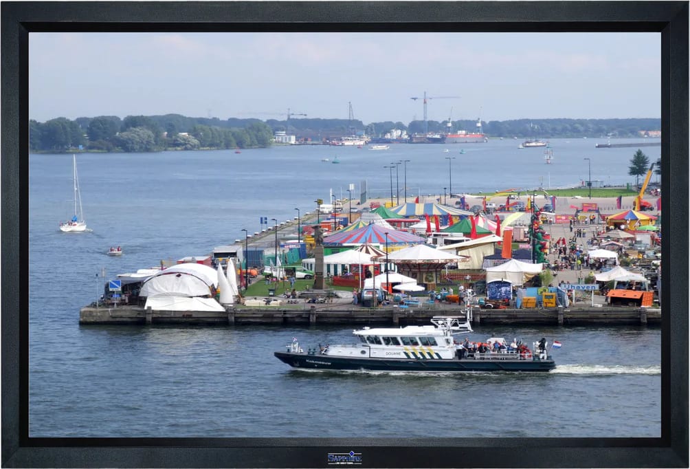 The Sapphire Fixed Frame Front Projection Screen is the perfect solution for dedicated applications, offering a sophisticated look with its stylish black velvet frame. The solid structure and tensioning system ensure that the screen is always perfectly flat, making it ideal for use with Ultra/short throw projectors.