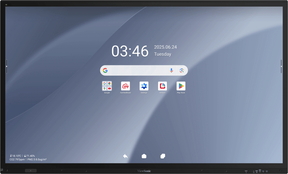The interactive flat panel features a smart sensor with Person-in-Room detection, allowing the display to automatically wake or enter sleep mode based on user presence, helping reduce energy consumption without requiring IT intervention. It also monitors environmental factors such as temperature, humidity, and ambient light to support more comfortable and productive working and learning conditions.